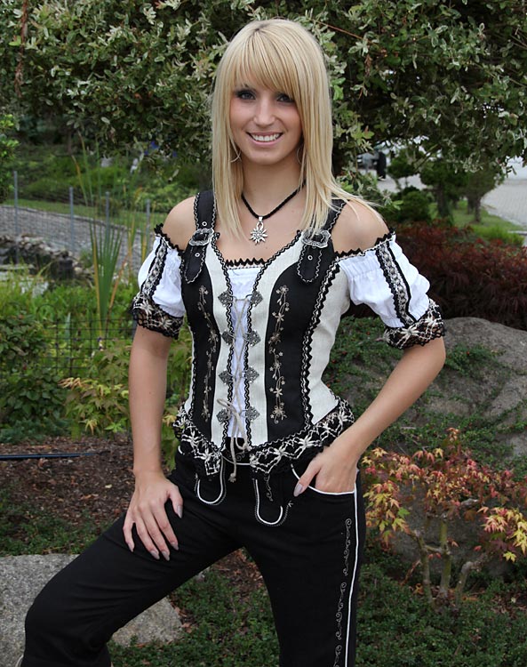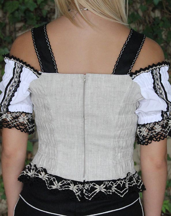Schönes Mieder mit Carmen-Arm in schwarz, natur und weiß.